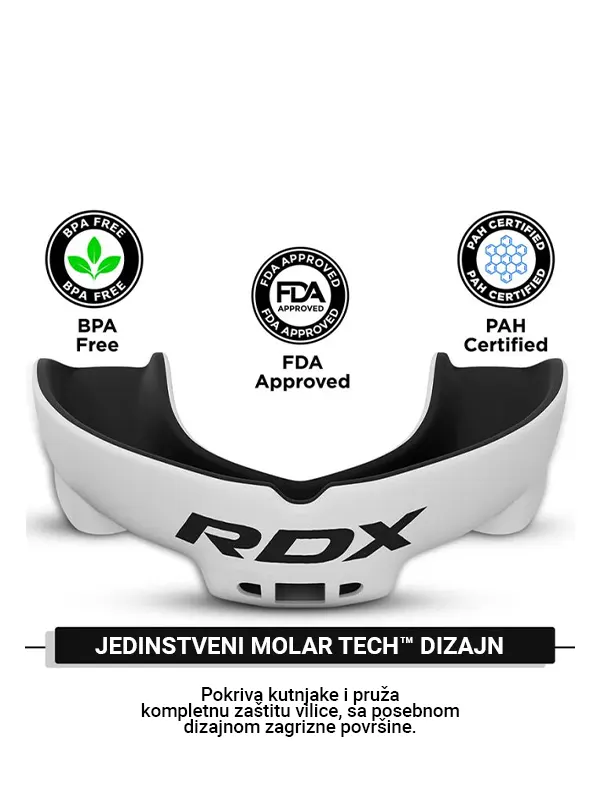 Kada je u pitanju zaštita vaših usta, morate biti sigurni da vaš štitnik za zube savršeno pristaje. RDX Štitnik za Zube se brine da vaši zubi ostanu sigurni zahvaljujući funkciji „boil-and-bite“, koja savršeno prilagođava zaštitu obliku vaših zuba. Opremljeni sa Shell-Shock™ tehnologijom koja efikasno apsorbuje udarce, dok Molar Tech™ pruža dodatni sloj zaštite za vaše dragocjene kutnjake. Pripremite se da uđete u borbenu fazu, a mi smo tu da zaštitimo vaš osmijeh bez obzira koliko težak bio vaš protivnik!