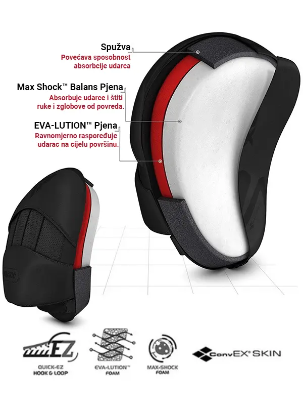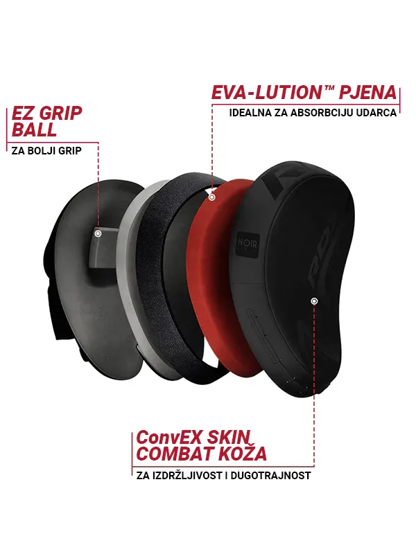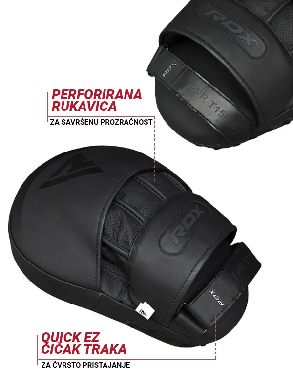 RDX T15 Noir Fokuseri su ručno izrađeni od izdržljive ConvEX Skin Combat kože, sa pojačanim šavovima za maksimalnu dugotrajnost. Idealni su za treninge brzine i kombo treninge. Pružaju vrhunsku ventilaciju, čvršći hvat i veću zaštitu za zglobove. Savršeni su za MMA, Boks ili Muay Thai. Unutrašnjost je obložena EVA-LUTION™ pjenom koja apsorbuje udarce, štiteći ruke i zglobove bez kompromisa po pitanju sigurnosti. Prozračna komora za ruku s ventilacijskim rupicama će se pobrinuti da vaše ruke ostanu suhe tokom intenzivnog treninga čime se smanjuje znojenje i rizik od razvoja bakterija. EZ Grip Ball na dlanu poboljšava kontrolu i stabilnost kod hvata i držanja fokusera, dok QuickEZ čičak traka omogućava brzo i sigurno fiksiranje bez pomjeranja i klizanja fokusera.