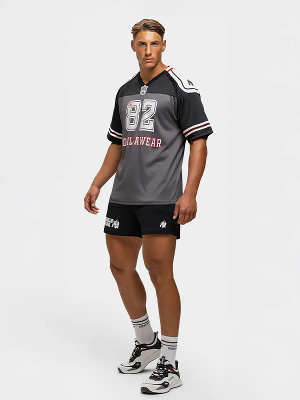 Gorilla Wear TYLER Dres je muška sportska majica inspirisana američkim fudbalom, sa oversized krojem i klasičnim V-izrezom na vratu. Dizajnirana je za one koji žele spojiti streetwear izgled i funkcionalnost za trening, uz odličnu prozračnost i slobodu pokreta. Napravljena je od 100% recikliranog poliestera, koji je lagan, izdržljiv i brzo se suši, što je čini idealnom i za teretanu i za svakodnevno nošenje.